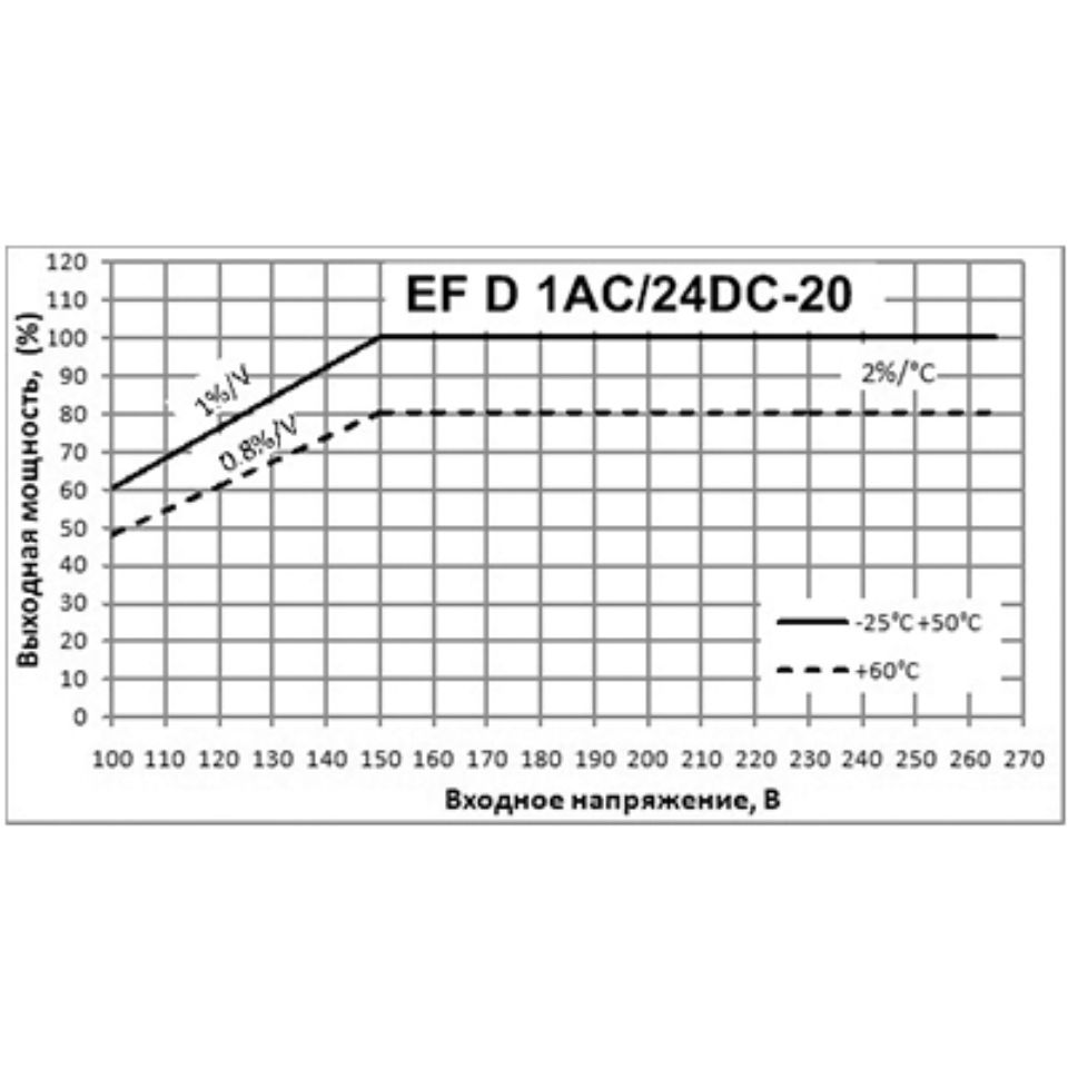 | EF D 1AC/24DC-20 | 100...264 В АС (45 – 65 Гц), при входном напряжении ниже 150 В допустимое значение Pмакс снижается линейно с наклоном 0,8%/В