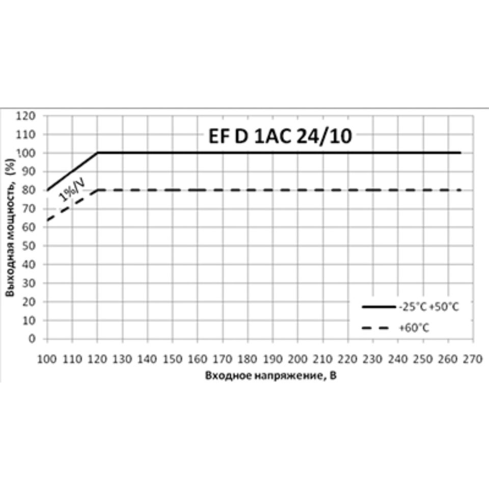 | EF D 1AC/24DC-10 | 100...264 В АС (45 – 65 Гц), при входном напряжении ниже 120 В допустимое значение Pмакс снижается линейно с наклоном 1%/В;