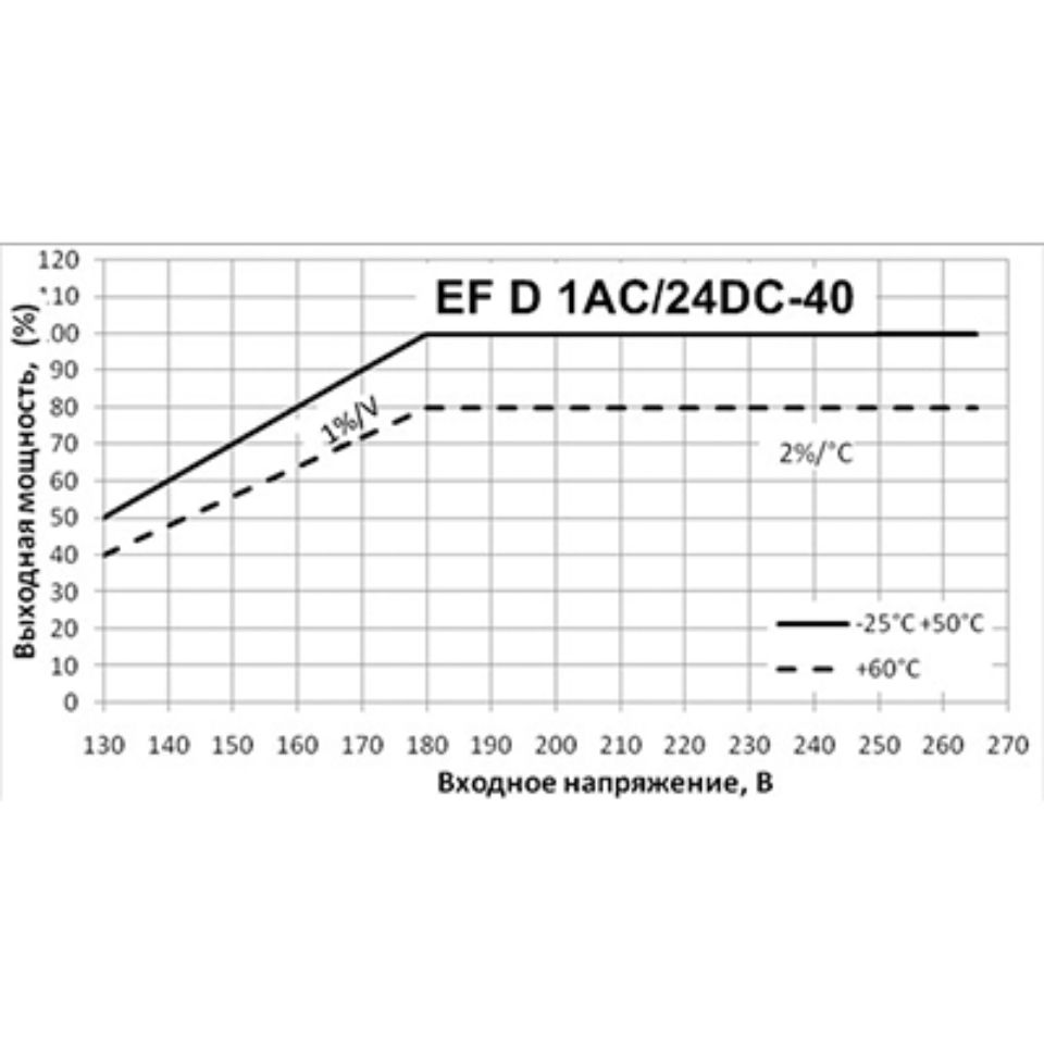 | EF D 1AC/24DC-40 | 130...264 В АС (45 – 65 Гц), при входном напряжении ниже 180 В допустимое значение Pмакс снижается линейно с наклоном 1% / В