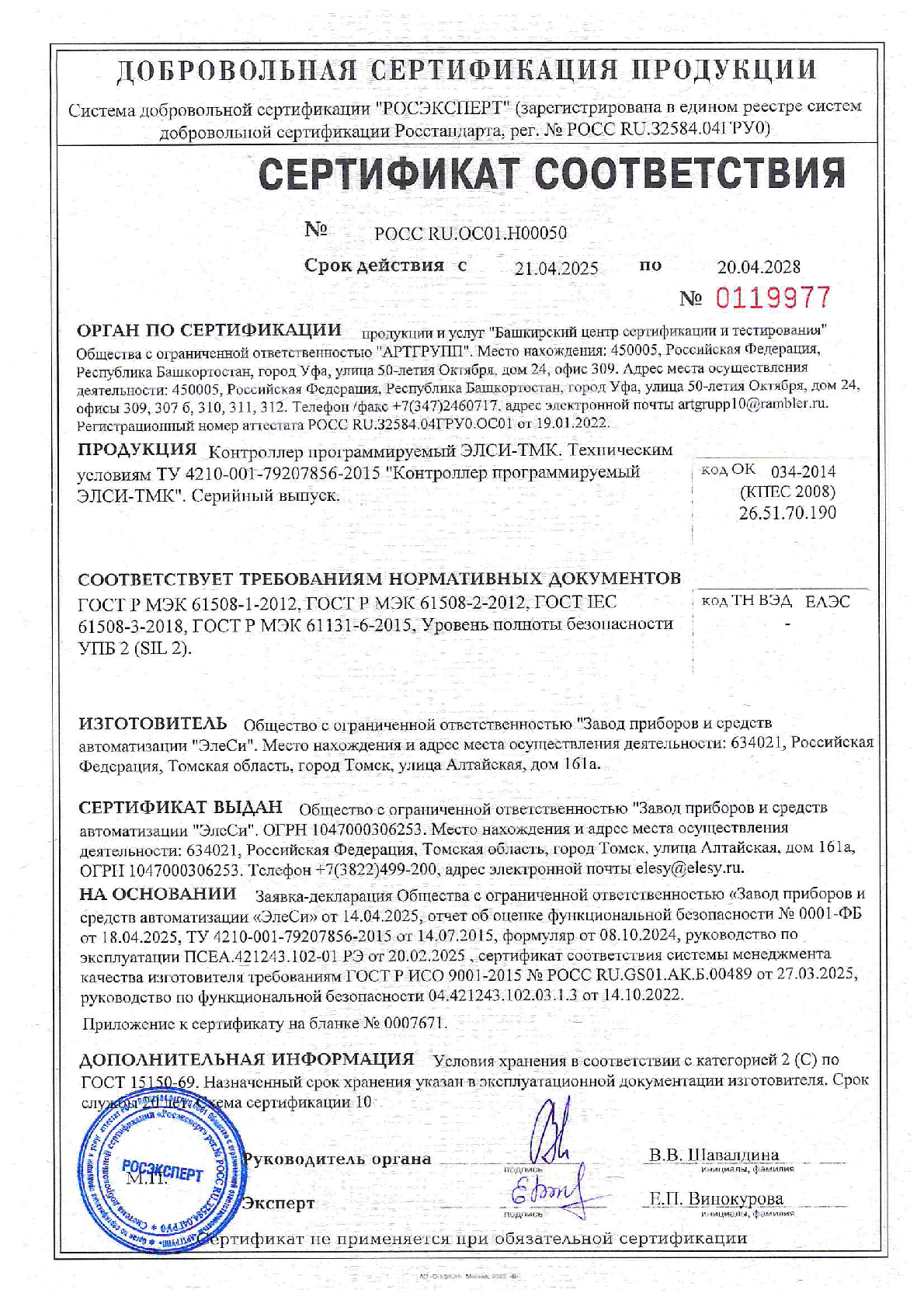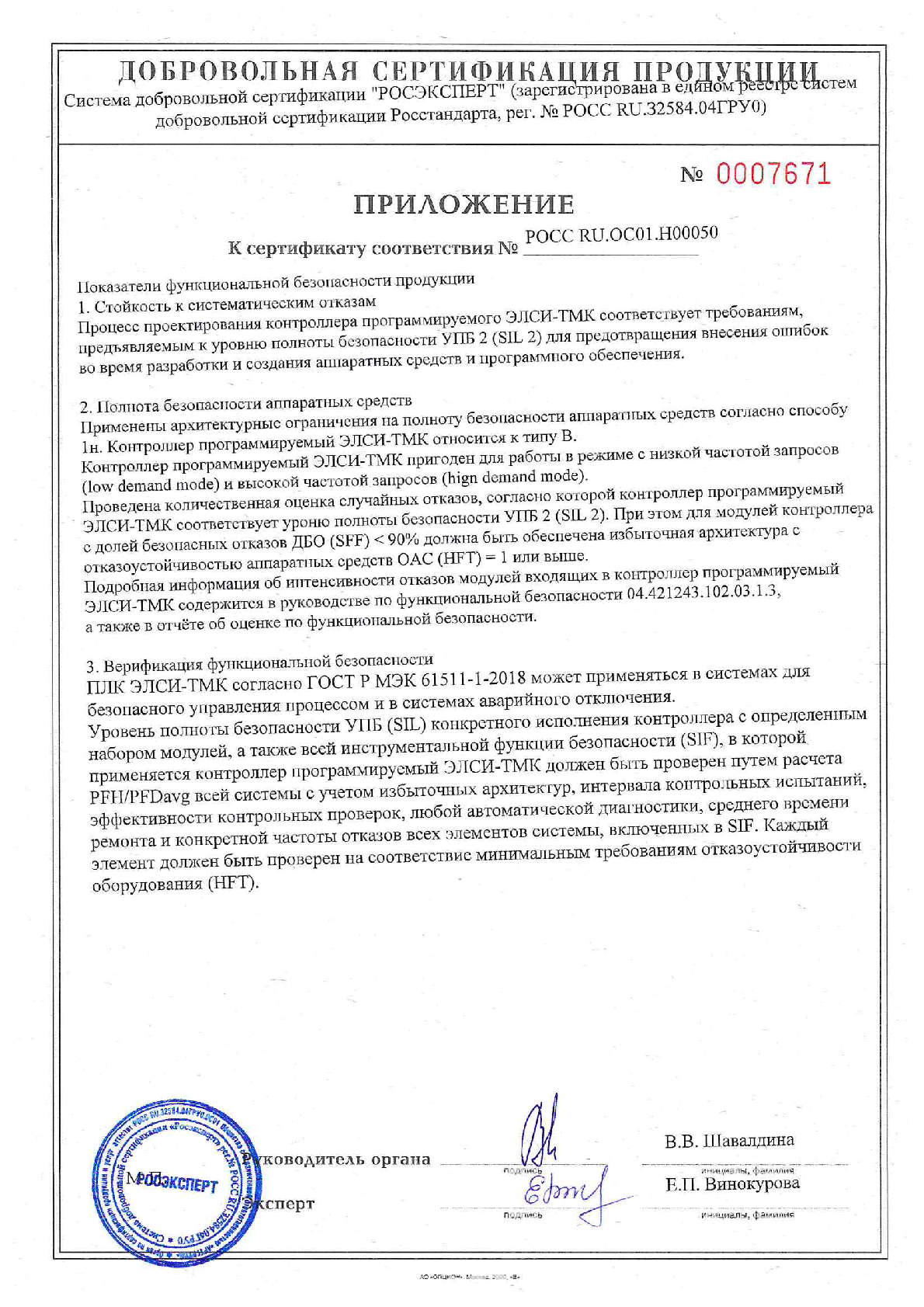 Сертификат соответствия. Добровольная сертификация. Уровень полноты безопасности УПБ 2 (SIL 2)
