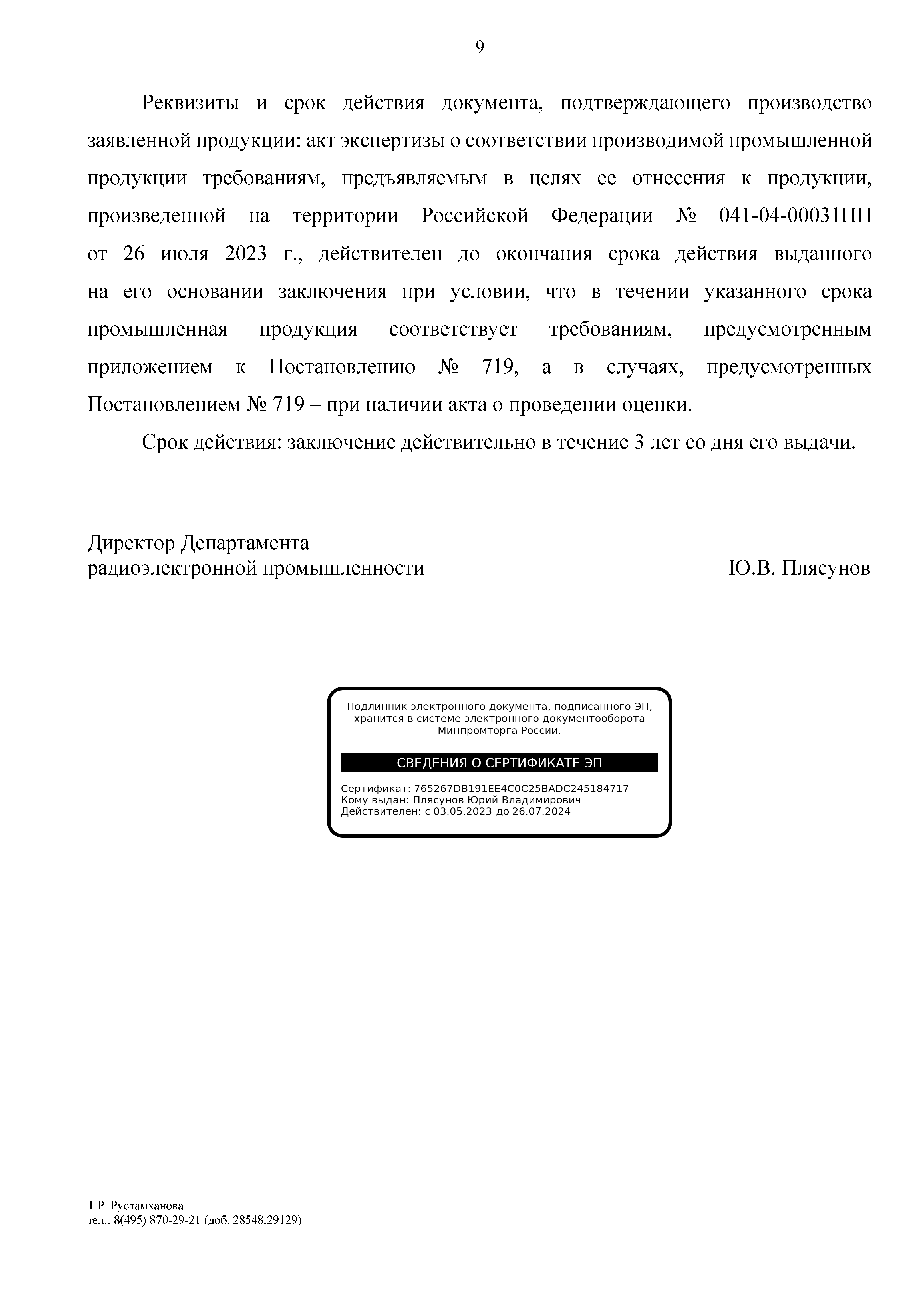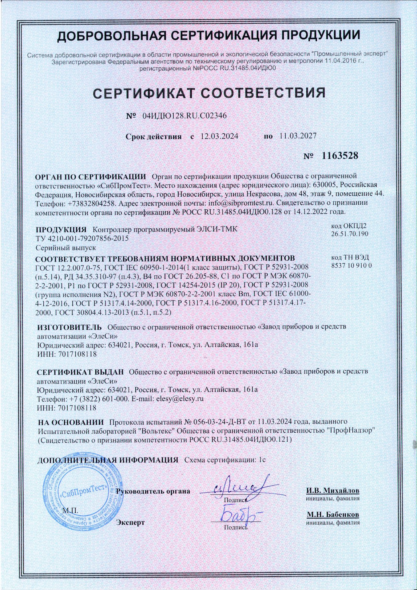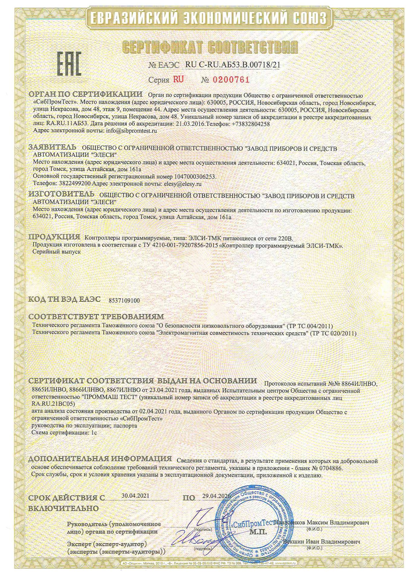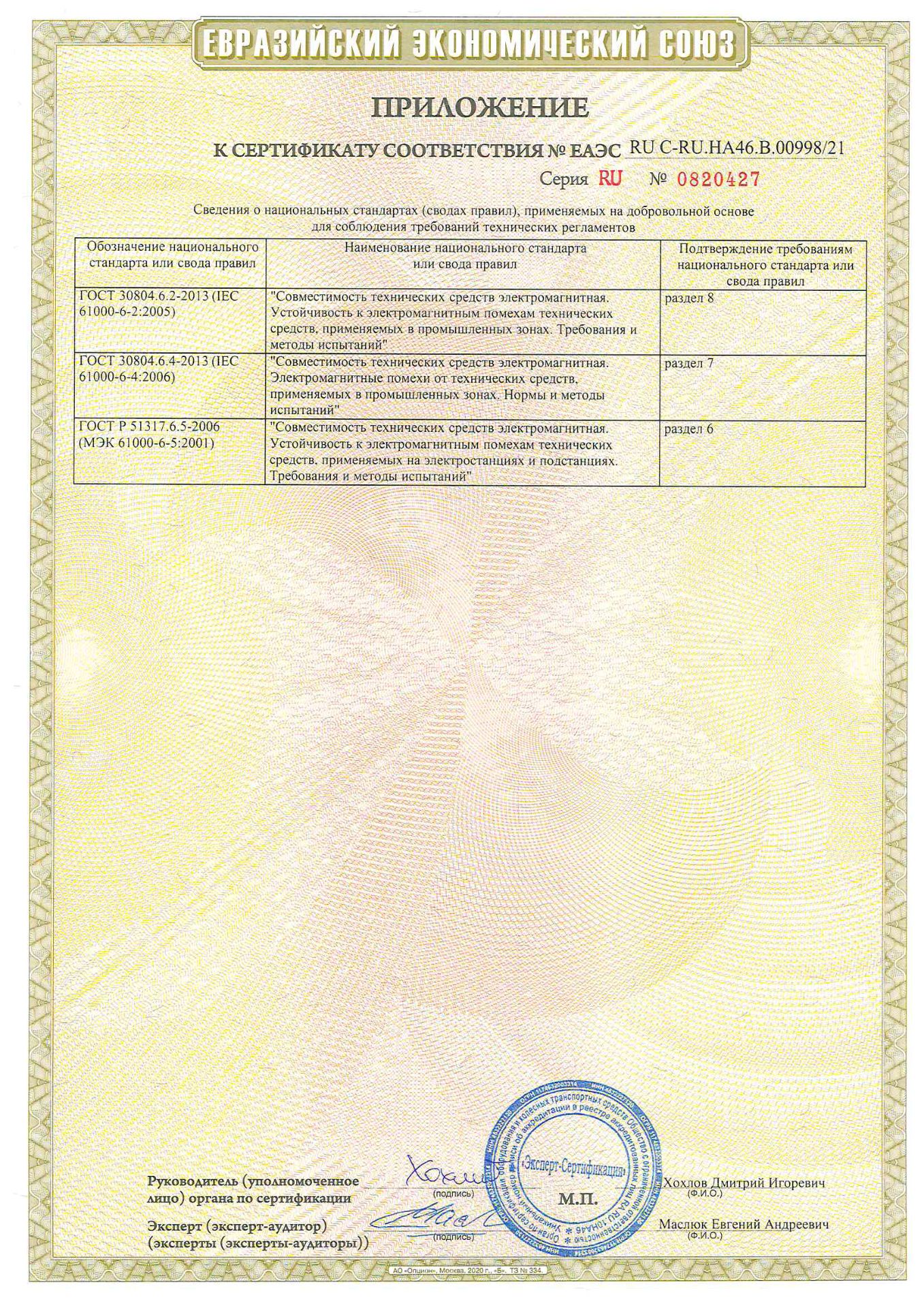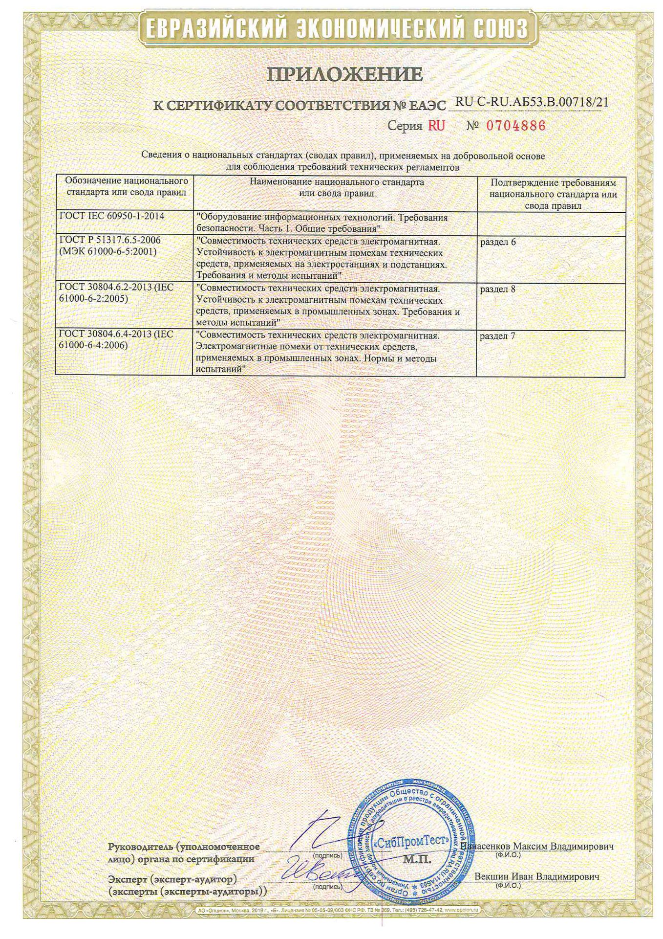 Сертификат соответствия «О безопасности низковольтного оборудования» (ТР ТС 004/2011), «Электромагнитная совместимость технических средств» (ТР ТС 020/2011)